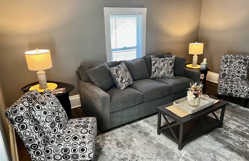 This Unit is an upper large 1 bedroom 1 bathroom which does sleep 4 with a queen size sofa bed in the living room and Kitchen is equipped with all your getaway needs. Bathroom does have a clawfoot bathtub/shower. Unit is walking distance to downtown and several restaurants and parks. This unit also features off street parking and internet TV..