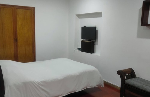 At the historic center of Bogota, walking distance to museums, restaurants, shops, galleries, universities, turistic sites. In a colonial house, duplex space w/ kitchen, dining, bathtub, fully equipped. Quiet, relaxing, comun terrace & patios. Ubicado en una casona colonial, diseño único, duplex con cocina, baño con tina, comedor, equipado. Ambiente cálido y amable en el centro de Bogota, cerca a museos, restaurantes, universidades, puntos turísticos. Terraza y patios de uso común RNT20628.