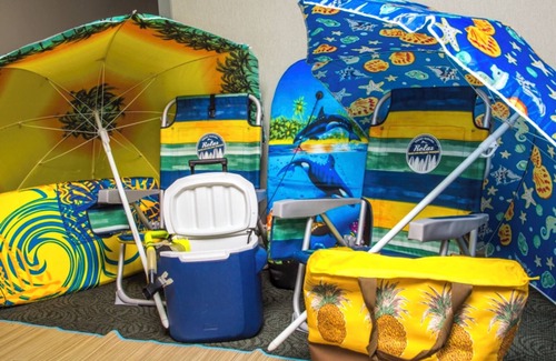 - beach chairs + sun umbrella + cooler + boogie boards