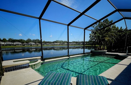 however, the true highlight of this dream vacation home is the outdoor oasis Step through the sliding glass doors from the main living area onto a screened-in lanai. Here, you'll find a sparkling pool that overlooks the picturesque lake. Comfortable lounge chairs invite you to soak up the Florida sun, while a covered dining area is perfect for al fresco meals.
