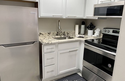 we provide everything that you’ll need The kitchen has granite counter tops and stainless-steel appliances including a full-size refrigerator/freezer, oven/stove, and microwave. The kitchen comes stocked with utensils, toaster, coffeemaker/Keurig, pots and pans, and much more.