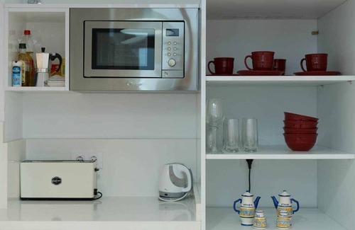 it is an apartment with two bedrooms each with its own balcony, one with double bed and one with two single beds, a bathroom, fully equipped kitchen with refrigerator, microwave, kitchenware, crockery and cutlery, ceramic hob, oven, coffee maker, toaster, and everything you need to prepare your meals
