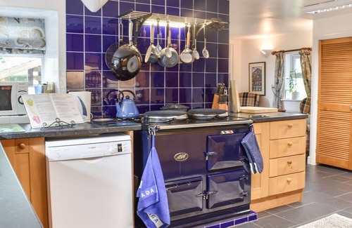 kitchen: with aga, microwave, fridge, freezer, dishwasher, coffee machine, washing machine and french doors leading to garden