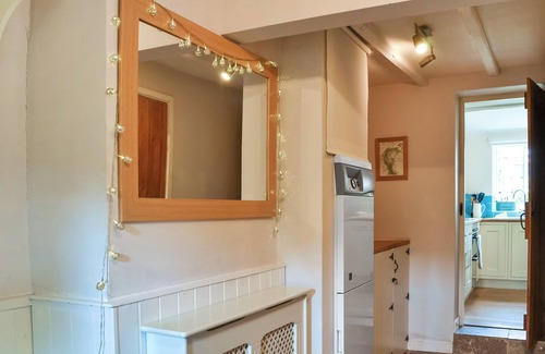 steps lead down into the inviting living room, where original beams and a wood burner create a warm and welcoming atmosphere A Smart TV is available for entertainment. Upstairs, you’ll find a double bedroom and a super kingsize zip-and-link bedroom, both featuring exposed brickwork and charming low windows. The house bathroom includes a bath with a shower over it. The enclosed garden at the rear of the cottage is a serene retreat, complete with mature flower beds and seating, perfect for outdoor dining.