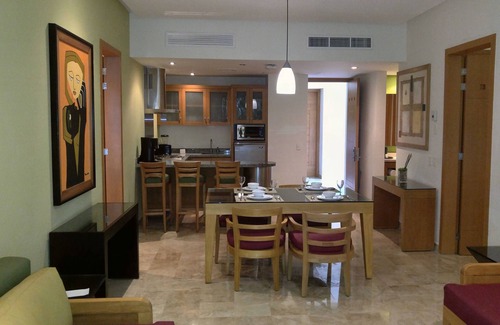 there is marble and tiles throughout the suite, private hot tubs and the largest swimming pools in mexico The beaches are wide and sandy. Rent includes twice-daily maid service, hotel amenities, and transfers from Airport.