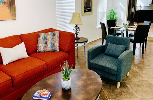 Take a Staycation or long-term stay at Casa Extravaganza! Spacious 2600SF, great kitchen with stainless steel appliances and granite countertops! You will enjoy the master suite bathroom jacuzzi tub, rain shower, and a huge walk-in closet! You will find very accessible and convenient that one bedroom with a queen bed and a bathroom with shower are located downstairs. Love to Netflix and Chill? Each bedroom comes with its own TV! Other great features include: Wi-Fi, security system, refrigerated air, chimney, recliner sofas, 2 king, 2 queen, and 2 double size beds, 2-car garage, barbecue grill perfect for carne asada! This house is in a safe neighborhood, ideally located only minutes away from I-10, Loop 375, new Amazon Center, restaurants, shopping centers, Marty Robbins Spray Park, and US/MEX Zaragoza Bridge; just15 minutes away from the airport..