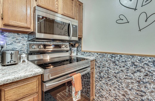 create great family memories at this 2-bedroom, 2-bath branson west vacation rental just minutes from silver dollar city This step-free condo combines rustic charm with modern comfort and offers plenty to do on-site and nearby! Hike trails to the lake, play a friendly game of horseshoes, or fire up the grill for an al fresco dinner on the deck overlooking the valley. come evening, cozy up for a movie night at this home away from home!