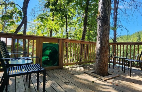 Our beloved Family Treehouse is a kid's dream come true. From the cargo net connecting the upstairs lofts, to the swirly slide on the deck, this treehouse is designed for fun! With a queen master bedroom, two twin beds in the loft, a bunk room with sleeping for 5, and a fold out couch, there is plenty of space to bring friends. A quick walk to the pool, volleyball court, hiking trails, and playground, it's the perfect unit for a family getaway. There is a full bathroom, a kitchenette with a microwave, fridge, and coffee maker, and AC/heat for comfortable, year round enjoyment..