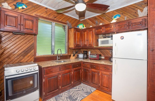 this home is close to the pool, and only a few steps to the beach It has an onsite washer and dryer, fast internet, 2 bedrooms, each with a split AC unit. A fully stocked kitchen, and everything you need for a comfortable relaxing stay. The grounds are well maintained and enjoyable to explore. The two story dock is great for watching sunsets. Just off the shore is some of the best snorkeling on the island. You will see dive boats that bring guests to this area as the reef is close enough to swim out to. This unit and my other one 11B El Papagyo have it all. We look forward to hosting you!.