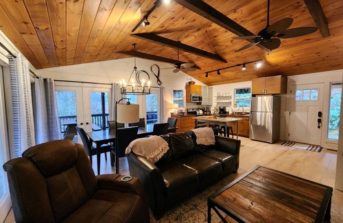 both cottages feature: hardwood floors with area rugs, wood ceilings and whitewashed wood walls, central air and heating for year-round comfort The fully stocked kitchens have all stainless-steel appliances, well-stocked spice racks, sharp knives, dishwasher safe pots and pans as well as hand mixers and blenders. There are three ways to make your coffee; Keurig, traditional coffee maker or a French press. The kitchens are open to the dining room and living room areas. The larger cabin can seat 6-8 people, the smaller seats 4 around the dining table. The living rooms have large screen smart TVs, extra center speakers, TV's are on Dish Network and they are Smart TV's so you don't miss your favorite shows. . Both cottages also have wireless routers for your internet needs. The master bedrooms feature king-size beds, and all bedrooms come with plush mattresses, updated bed linens and blankets coverings as well as updated towels in the bathrooms.