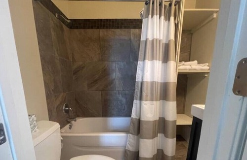 discover the epitome of relaxation in two brand-new king bedrooms, each meticulously designed with raised frames for additional storage beneath Sink into the embrace of plush pillow-top mattresses, ensuring a profoundly rejuvenating night's sleep. Each bedroom boasts a flat-screen smart TV, a desk for convenience, a dresser for your belongings, and a tastefully tiled bathroom.