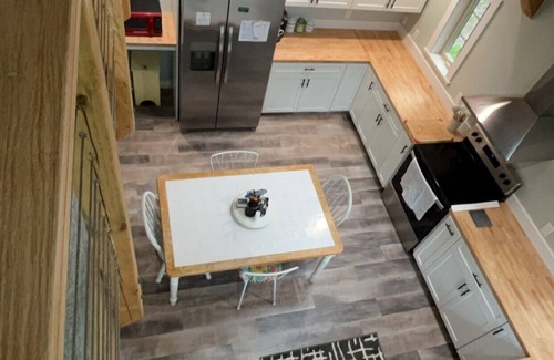 • downstairs: a cozy bedroom with full-size bed and a full en-suite bath (bathtub/shower combo)
