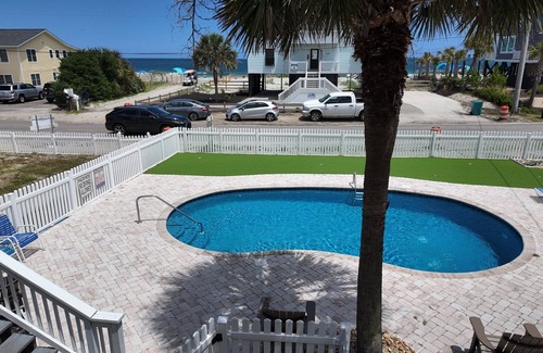 2nd row raised beach house only 20 steps to the ocean You will not find a better location in Garden City for your family. We are located south of the Garden City Pier in the Inlet Point area. Our home is a 4 bedroom 2 Bath with a half bath down stairs and a outside shower. Master bedroom has a king and private bath. Bedroom 2 has a queen and share a bath with bedroom 3 which has a queen as well. Bedroom 4 has bunk beds with the bottom being a double bed. New Sleeper sofa in den. My name is Rodney Rogers from Marion SC, please find me on Facebook for further questions.
