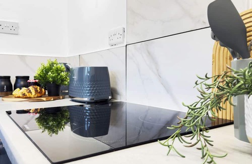 cook up your favourite meals in the modern kitchen, featuring an electric induction hob, oven, microwave, kettle, fridge-freezer and washer dryer — perfect for long stays