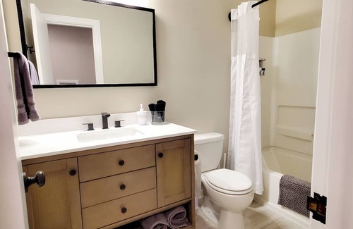 step into our family-friendly, vintage style home — a warm and welcoming space with plenty of room for everyone! upon entering, you’re greeted by a cozy living area featuring a large smart tv, perfect for relaxing after a long day Continue into the open-concept dining and kitchen area, where the spacious layout encourages family fun and easy conversation. Just off the kitchen, you’ll find a converted garage space complete with a second TV, simple at-home workout equipment, and laundry facilities for added convenience. On the other side of the home, you’ll discover comfortable bedrooms and bathrooms, offering a peaceful retreat.