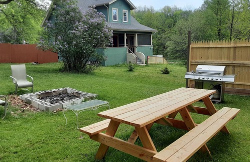 25 bathrooms, WiFi internet and tv, owner lives up the street and is usually available, kitchen is fully furnished, 15 acre property is a small working farm growing garlic, horseradish, small orchard, etc. Pond and barn on property. Home has full-size washer and dryer in basement, also baby grand piano not very well tuned at this time. Fire pit, bbq grill, picnic area exclusive to each house..