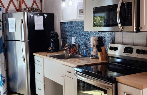 Our Grand Deluxe Yurt is designed to impress, with it's circular shape, giant dome skylight, canvas sides, and large deck, bring the whole family for an unforgettable experience. The 30' yurt can comfortably sleep 5 with a king size mattress in the main bedroom, a twin over twin bunk in the second bedroom, and a pull out couch in the living room. This unit has all the luxuries of home with AC/heat, a full bathroom, and a full kitchen with a stove, sink, microwave, refrigerator, and coffee maker. The deck is nestled next to the creek, furnished with a dining table, and there is a fire pit for you to relax and enjoy a fire by the creek.