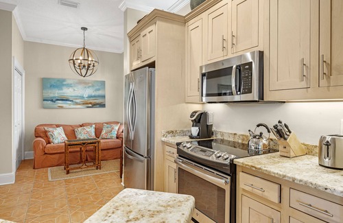many personal touches make this unit feel like home Extras provided for guest use include beach towels, chairs and toys as well as movies and CDs. The overall decor is warm with a casually sophisticated "West Indies" motif including old-fashioned dark wood slat blinds, crown molding in all rooms and a down-wrapped sleeper sofa in the living room. The kitchen is very well equipped and includes a heavy-duty blender and Keurig and a standard coffee brewer as well as a couch nearby. The balcony area features a high-top table for four and a lounge chair with cushions.
