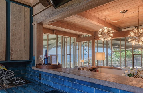 the mid-century vintage kitchen has original blue tile counters, a double oven and a bosch electric cook-top The dining area is slightly elevated above the living area and has ocean views.