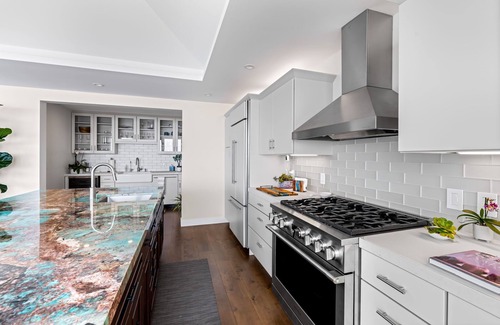 the immaculate kitchen is fully-equipped with everything you need and has high end appliances and special finishes including a paneled refrigerator, large gas stove, two sinks, a coffee bar and a large central island with an impressive amazonite counter-top in tones of the sea
