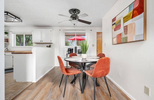 guests may park on the street, in the driveway, or in the two-car garage After entering through the front door into the entry space, you'll find a cozy living room with a comfy couch and 50" TV. Past the living room is the large kitchen with a table for four, granite countertops and stainless-steel appliances. A stacked washer and dryer is conveniently set in a laundry closet in the kitchen, with bifold doors for sound control. Off the dining area is the surprise second loving room, for extra space to relax and unwind.
