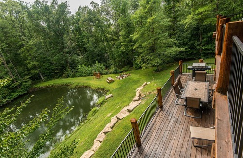 enjoy your morning coffee on the 40-foot log front porch Watch for the dancing hummingbirds, listen for the woodpeckers, and enjoy the variety of birds singing. Consider having breakfast on the second story deck, deer and turkeys tend to frequent the property during the early morning hours. Spend your days playing corn hole, bocce ball, cooking out, rocking on the porch chairs, swinging down by the pond or go fishing. *Pet owners please watch your pond loving pet. Please do not allow them WET in the house or on the furniture. Maybe you will catch a bass, catfish, or blue gill. Catch and release fishing. Don’t let the goldfish or Koi fool you. There is plenty of gamefish swimming in the pond. The small and large mouth bass enjoy snacking on goldfish, baby blue gill, and baby koi.