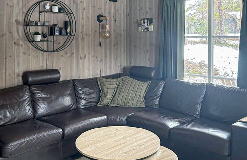 experience relaxing days in the middle of vast forests and enjoy the tranquillity of this special environment Your cosy holiday home near Solhomfjell is the ideal base for active excursions and relaxing hours by the fire. Make yourself comfortable in the open-plan living area. Relax in the large sofa area or enjoy your meals at the long dining table with a view of the natural surroundings. The wood-burning stove provides cosy warmth, while the open-plan kitchen invites you to cook together. Large windows let in plenty of light and bring the outside in.