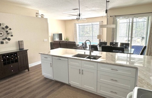 Be our Guest at our 'Home away from Home'. Loaded with upgrades our 4 bedroom, two bath, home with private screened in pool offers granite counter tops in the kitchen and baths, travertine tile in the baths, and new furniture in the family room. Cable TV in all the bedrooms and living room. The master suite has a king- size bed, second bedroom has a queen, and the third and fourth bedrooms have two twin beds each, For additional family fun, enjoy our game room, equipped with a full size pool table, Foosball table, and air hockey. We also have wireless Internet service. Enjoy the south facing screened in pool and lanai area, offering a peaceful and private view of the conservation area in our back yard. Full service kitchen and gas grill for outdoor grilling, plus a washer and dryer..