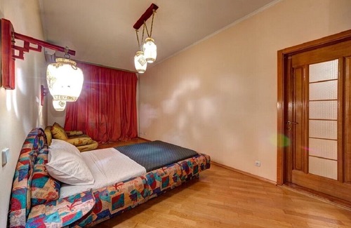 Cozy three-room apartment on Shota Rustaveli street Apartments on Shota Rustaveli street 40 is a choice for guests in the amount of up to 7 people. The features of the apartment are: - fragments of the Moroccan style of one of the bedrooms; - walking distance to the central sports arena of the country NSC Olimpiyskiy - 350 m (the nearest metro station Ploschad Lev Tolstoy - 350 m); - Close proximity to many eateries. Bedrooms differ from each other in the way that only two rooms can differ, never united by a common idea. The first of the bedrooms has a nice oriental Moroccan accent in the form of geometrically oval gold-painted lamps placed on a mahogany plank. The sleeping bed at the head is equipped with an arch with a mirror and two stands, designed for two people to rest, there is also a folding sofa (double) in the bedroom, there is air conditioning in the wardrobe to create a microclimate. The next bedroom is the exact opposite of the first. Made in light peach soothing colors, bedroom furniture in Italian walnut color, double bed with orthopedic mattress, mirror and chest of drawers. The living room-studio with access to the balcony, which offers a gorgeous view, is equipped with a leather armchair and sofa, TV, glass coffee table. The kitchen area has a bar counter where you can slowly drink a cup of coffee in the early morning, and from household appliances there is: - gas stove with oven; - microwave; - Electric kettle; - fridge. The bathroom will please you with a shower cabin with Jacuzzi effect, a washing machine, a bathtub, a mirror with illumination. Places that may be of interest to visitors to the city: - Kiev planetarium - 650 m; - SEC Gulliver - 550 m; - MAMA MANANA (Georgian cuisine) - 350 m; - Puzata Hata (Ukrainian cuisine) - 400 m; - Fine Familia (Mediterranean cuisine) - 450 m; - Art. m. Palace of Sports - 350 m..