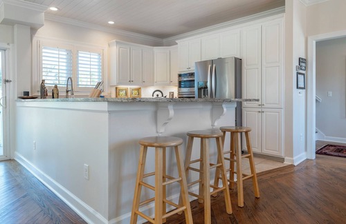 carolina elegance north is a two-story spacious home with garage access The first floor offers a generous living area with plush seating, dining space, and a large HDTV. Step onto the screened porch/sunroom for lounging, reading, or morning coffee. The well-appointed kitchen with granite countertops and a pass-through to the dining room makes morning coffee with a marsh view a delight. The laundry room is located on the first floor along with a half bath. A king bedroom overlooking the pool and marsh with a full bath completes this level.