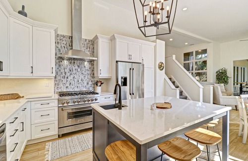 • completely new kitchen with all new appliances, built-in beverage fridge, gas range New kitchen island with a prep sink and bar top seating. High ceilings with a skylight over the island.
