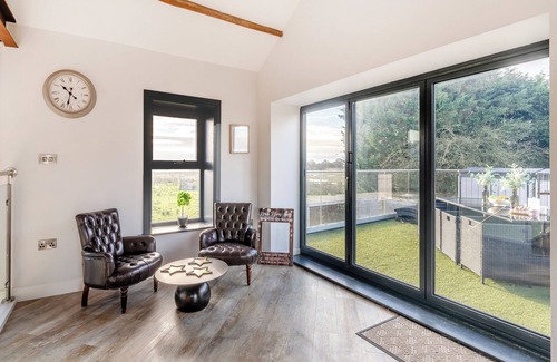 bathroom: bath with shower attachment, heated towel rail, toilet Oil underfloor central heating, electricity, bed linen, towels and Wi-Fi included. Initial logs for wood burner included. Travel cot, highchair and stairgate. Welcome pack. . Large enclosed lawned garden with patio, garden furniture, BBQ, firepit and summerhouse. Children’s play area. Balcony with outdoor furniture. Hot tub for 8 (private). Bike store. Private parking for 4 cars. No smoking. Please note: There are 5 steps in the garden. Sorry, no hen or stag parties. This property has a security deposit of £300.. Get that sense of delight as you relax during your stay at this stunning barn conversion. The owners have not held back in making this a very luxurious stay for you. Ideal for those special occasions when a family get together should be something to remember, or with old friends who enjoy good company and fine surroundings, there is everything here to make this a very memorable stay.