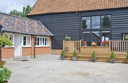 bathroom: bath with shower attachment, toilet Oil central heating, electric underfloor central heating (on the ground floor), electricity, bed linen, towels and Wi-Fi included. Travel cot and highchair available on request. Welcome pack and doggy extras. Enclosed lawned garden with sitting-out area and garden furniture. 4-acre natural grounds. Bike store. Private parking. No smoking. Please note: There is a pond in the grounds, 20 yards away. This property has a security deposit of £300.. Set on a quiet country lane, this stunning, detached, Grade II listed barn conversion is perfect for a relaxing family holiday or celebration. Steeped in character with a wealth of beams, the spacious dining room has a vaulted ceiling and bi-folding doors, opening onto decking and an enclosed garden with views over open countryside. There is a large kitchen, a TV snug, a second living room and a games room. Guests can enjoy exploring 4 acres of grounds including a small orchard. Situated just a few minutes drive from the well served village of Laxfield, Rose Farm Barn is conveniently located for exploring the Suffolk coast and countryside. The nearby historic market towns of Framlingham and Halesworth have a range of interesting shops, restaurants and cafés, all housed in buildings of many ages. Framlingham also has a 12th century castle, a splendid example of Norman architecture. Aldeburgh, famous for its fish and chips and links with Benjamin Britten, and Southwold with its pier and colourful beach huts, Snape Maltings concert hall, Orford and the RSPB reserve at Minsmere, are all within easy reach. Travelling inland, guests can enjoy the ancient burial ground at Sutton Hoo (NT) and the riverside market town of Woodbridge, with its swimming pool and independent cinema. Shop, pub and restaurant 2 miles.