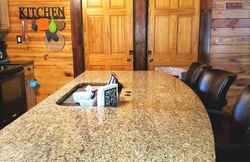the iron willow was originally a lake cabin! it was moved to it's current location about 25 years ago (sorry, no lake!) The fully stocked kitchen includes a full-size refrigerator with water dispenser and ice, electric stove, microwave, keurig coffee maker and more. The main level has a vaulted ceiling, open floor plan, kitchen island with seating and window air-conditioning units. The master bedroom with TV, a bunk-bed room and a full bath are also on the main level. There is an Echo Dot with Amazon Alexa in the living room. ask alexa (via echo dot) to turn on the tv, play some music, turn off the lights, lock the doors and more!