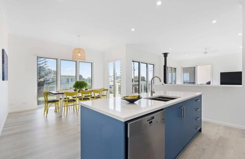 the dining area allows for eight people to sit and relax and watch the ocean while enjoying meals Adjacent to the dining room is the kitchen and includes bar stools at the bench and a view of the sea at the end of the street. The kitchen is equipped with a French door fridge/freezer, gas cooktop, electric oven, dishwasher, microwave, Delonghi pod coffee machine and more.