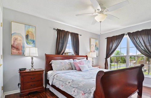 spacious home minutes to disney world (you can see fireworks form pool) A 5 Bedroom 4 bath homes comes with 2 MASTER SUITES which feature IN-SUITE BATHS. Located in a GATED community that is five minutes (to ten) from DISNEY WORLD - you can reach the park without encountering the traffic of the I-4 or the 192. The POOL features a covered lanai and looks out over to the Disney parks where at night you can see the fire works.