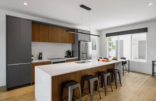 enter an expansive living space tailored for comfort and gatherings The contemporary d cor includes a sofa bed for additional sleeping options and a smart TV for entertainment. Adjacent, discover a fully stocked kitchen featuring high-end appliances, a large island with bar seating, and essential cooking amenities. Begin your day on the tranquil private balcony accessible from the kitchen, furnished to enhance your morning routine.