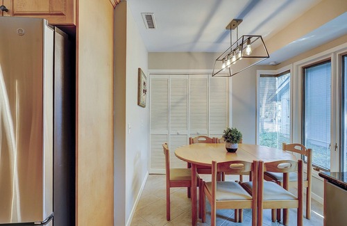 a few steps lead to the front door and into this beautiful 3 bedroom, 3 bathroom villa with a ton of natural light and comfortable furnishings The main great room features an open concept dining and living area with high beamed ceilings. The great room offers a large L-shaped sectional couch, a flat screen TV, a dining table with seating for 8, and access to a patio. The patio provides a comfortable outdoor dining option with a propane grill and spectacular lagoon views offering a unique eye on the natural beauty of Hilton Head Island. The kitchen is fully equipped with newly upgraded appliances and contains an additional dining space with seating for 6. The kitchen also features a large pantry and laundry closet with a washer and dryer.