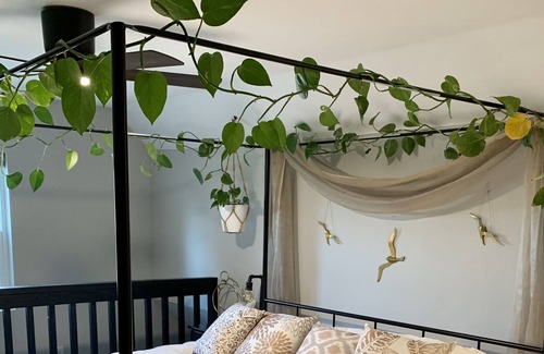 This upstairs paradise with it's own private entrance is sure to welcome you with it's comfortable king size bed and private bath, from the rustic stairs to the living plants. This luxury space is meticulously cleaned and equipped with a state of the art air filter. We make our very best effort for you to feel at home. There is on site parking, snacks, coffee, and Netflix provided.