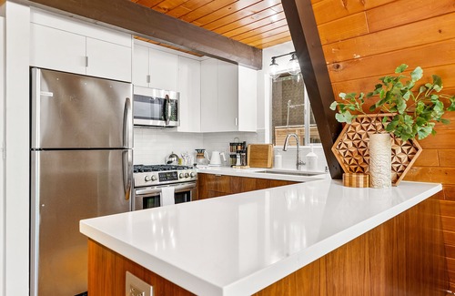 after a trip to the local farmers market, come home and whip up delicious home-cooked meals easily and conveniently, with our newly renovated, open kitchen This modern cabin kitchen boasts pristine white quartz countertops and gorgeous walnut cabinets. It’s equipped with everything you need to feel at home – brand new stainless steel kitchen appliances, including a refrigerator, gas range, microwave, and dishwasher, kid-friendly dishes and cutlery, pour-over drip coffee kettle, automatic coffee machine, and even a rice cooker.