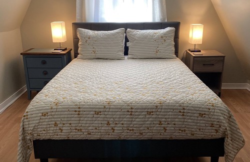 set back off the road on private 2 acres House with 2 bedrooms each with queen beds and a sleeper sofa in the living room. Free wifi available as well and several places to charge your phones or tablets. Smart TV for streaming your personal account. Fully equipped kitchen with all the essentials needed for cooking. (Just bring your own food) Enjoy the patio with grilling right from the deck and eating outside in the picnic area. Enjoy a dip in the hot tub or play a game of horseshoes. We strive to make your stay as enjoyable as possible.