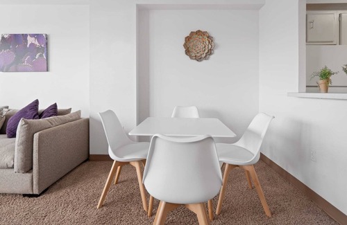 the living room also boasts a sofa, an accent chair, and smart tv with streaming services There's a space-friendly dining area with a table set that can seat up to four people.
