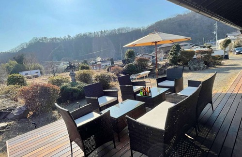 new floor heating, toilets, and bathsWinter is also cool.There is also a steam sauna in the glass-walled public bath.Pets are allowed in the living room on the floor.BBQ on the wood terrace and a large supermarket at the back.