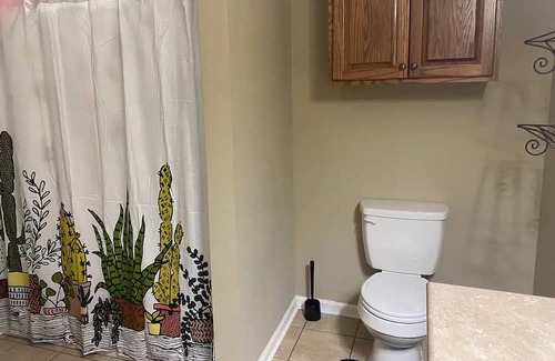 A nice getaway nice kitchen a screen in porch with a table and chairs to watch the sun rise over the river has a boat ramp on property and a dock to put ur boat on and fish off of its down a dirt road and in the country it has a bonus room downstairs upon request for extra charge.