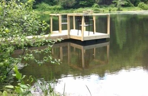 there is a floating dock at the edge of the lake The canoe and the floating dock are shared with guests of the tipi. The dock has a ladder, which is the best way to access the lake to swim.