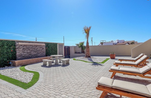 WELCOME TO A WAVE FROM IT ALL, a stunning ocean-view escape in Rocky Point, a perfect retreat for large families and groups seeking relaxation, comfort, and breathtaking scenery. Just a short walk from the beach, this spacious property accommodates up to 15 guests (with prior approval and an additional fee) and features three scenic terraces, a large yard, and a rooftop party deck complete with a wood-burning fireplace and built-in grill—ideal for unforgettable gatherings under the stars. – MAIN HOUSE The beautifully designed main house includes five bedrooms and five and a half bathrooms, offering plenty of space for comfort and privacy. On the ground floor, you'll find a spacious living room with comfortable seating and a Smart TV, with easy access to the yard and terraces, perfect for relaxing after a day at the beach. The ground-floor master suite features a king-size bed, a walk-in closet, a smart mirror, and a private en-suite bathroom. Also on this level, one bedroom offers two sets of bunk beds with its own private en-suite bath, while a queen bedroom and an additional king bedroom share a full bathroom. – UPPER-LEVEL Upstairs, the fifth king bedroom includes its own private en-suite bath, ideal for added privacy. The upper floor also hosts the main living space, complete with a large sectional sofa, 65” Smart TV, card table, board games, and a surround sound system. A gourmet kitchen is equipped with high-end appliances, including an industrial-grade Sub-Zero refrigerator, a wine fridge, and a walk-in pantry. The kitchen also features an island with barstools for casual dining and socializing, plus a dining set for 8 people.