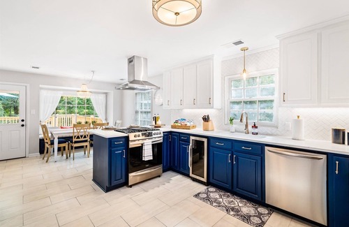 upstairs enjoy the fully renovated kitchen stocked with everything you would need to create a multi course meal If grilling is your thing, don't worry, there is a propane grill just outside. Clean up is a breeze with the new dishwasher and extra large sink. Who doesn't like options? Choose between dining alfresco on the string lit porch, the breakfast nook with cozy bench seat or the formal dining room that seats up to 8.