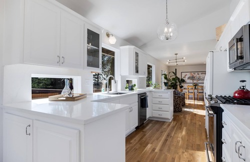 the home features a fully equipped kitchen with updated appliances, lots of space for cooking, and gorgeous quartz countertops You'll find everything you need for preparing almost any dish! Serve up that perfect meal to family and friends with a dining area with seating up to six guests. Wake up the next morning with a fresh cup of Caravan Coffee, courtesy of Lifestyle Properties. The charming kitchen is designed to help you whip up a tasty dish, or put together an appetizer plate to go with your wine. Set out a few small bites on the kitchen counter or dining room table while you indulge in a bottle of local wine.