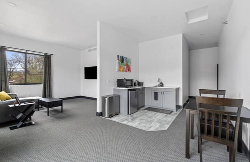 these upscale apartments offer easy access to downtown - we’re right on main street! perfect for professionals, couples, or connect to pyrite for a family holiday Each apartment boasts a king-sized bed and a living room with a convertible sofa and extra large smart TV. The kitchenette has a microwave, mini-fridge, French press, and dishes. There is fiber to the building, so Wi-Fi service should not degrade, even when using multiple devices.