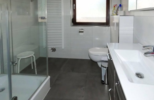 3-room apartment 75 m2, on the ground floor Cosy furnishings: living room 35 m2 with satellite TV (flat screen). Exit to the garden, to the terrace. 1 room 13 m2 with 1 double bed (180 cm, length 200 cm). 1 room 9 m2 with 2 beds (90 cm, length 200 cm). Open kitchen 9 m2 (4 hot plates, oven, dishwasher, kettle, microwave, electric coffee machine) with dining nook. Shower/WC. Gas heating. Large terrace 20 m2 partly roofed, garden 250 m2, lawn 150 m2. Terrace furniture. Beautiful view of the mountains. Facilities: hair dryer. Internet (WiFi, free). Please note: non-smokers only. Private entrance, smoke alarm, fire extinguisher. Lake 150 m away.